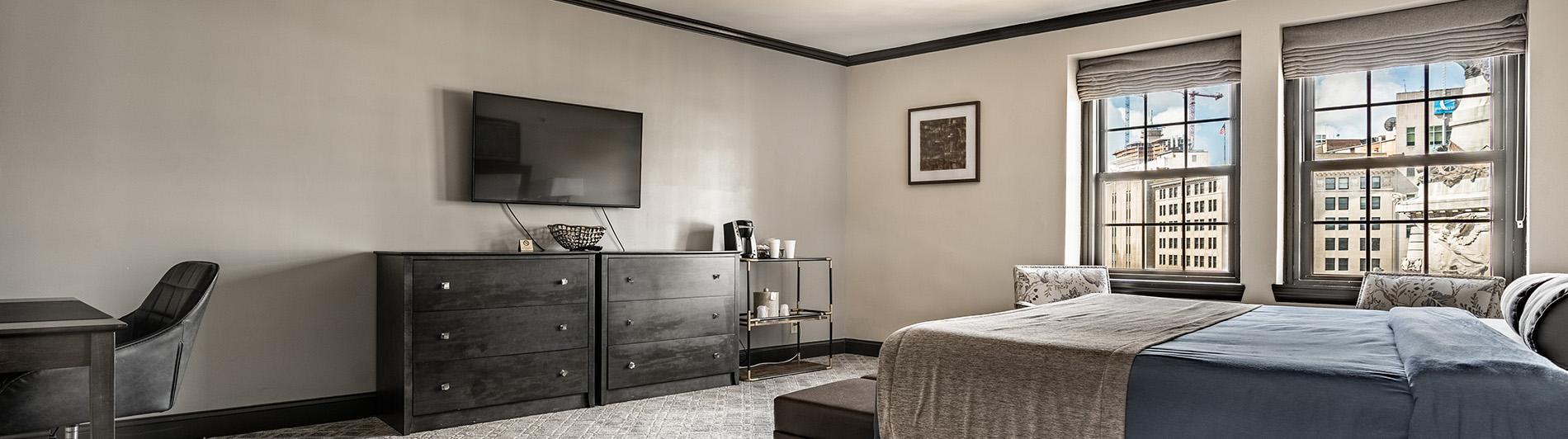 The Columbia Club has a two bedroom in-room suite available for private booking. The two bedroom suite on the sixth floor comfortably accommodates six overnight guests. This room also enjoys beautiful views of Monument Circle. The master bedroom features a king size bed and the guest bedroom boasts two double beds. Each bedroom enjoys an attached modern bathroom with zero gravity showers and marble finishing's. The sleek bar and kitchenette feature a dishwasher, mini refrigerator, freezer, and pantry; making this space an excellent choice for entertaining small groups, settling in for the weekend or enjoying a long-term stay. The Harrison Presidential Suite is perfectly situated for more intimate and private settings.